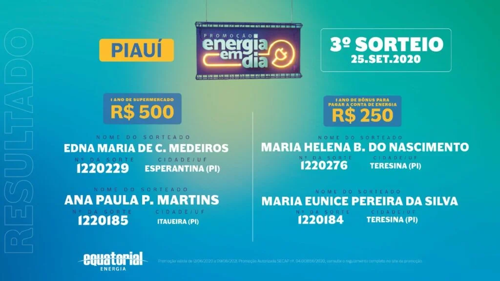 A Equatorial Piauí realizou a apuração dos números da sorte divulgados pelo sorteio da Lotomania realizado no dia 25 de setembro e, após auditoria, apresenta hoje (02), os 04 ganhadores do 3º sorteio da promoção Energia em Dia.