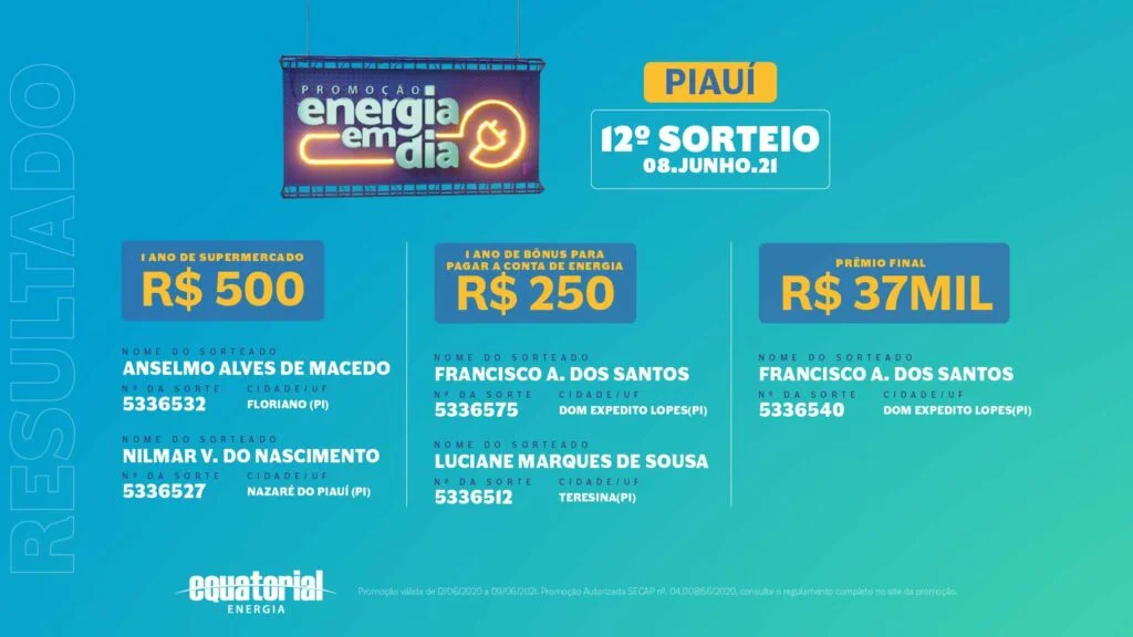A promoção Energia em Dia foi autorizada pelo SECAP nº 04.008156/2020. Para mais informações sobre os sorteios e resultados, acesse o site da distribuidora (www.equatorialenergia.com.br) ou confira a divulgação do resultado final nas redes sociais da Equatorial Piauí.